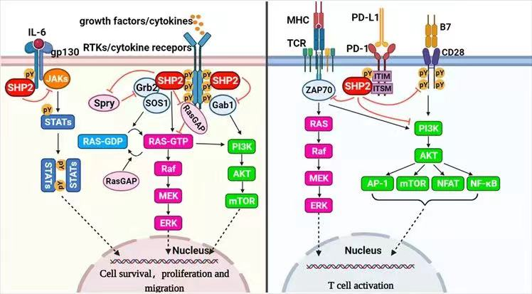 SHP2蛋白是一種去磷酸化酶,屬于PTP家族,作為Ras-Raf-MEK-ERK、JAK-STAT、PI3K-AKT-mTOR和PD-1/PD-L1等多種經(jīng)典信號通路的匯聚節(jié)點,可以增強或拮抗與經(jīng)典細胞存活相關(guān)的和具有底物特異性的免疫調(diào)節(jié)途徑,在腫瘤中具有雙面作用,既可以作為磷酸酶發(fā)揮顯著的致癌功能,也可以以環(huán)境依賴的方式作為腫瘤抑制因子。