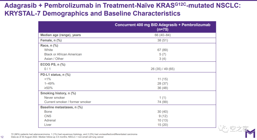 在Ph2臨床KRYSTAL-7試驗中,共入組75例初治KRAS G12C突變的NSCLC患者,其中包含了PD-L1表達水平不同的亞組。
