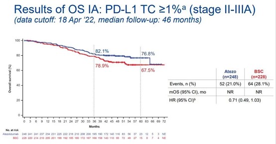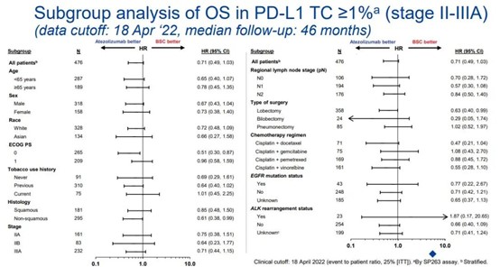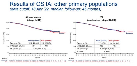 在臨床截止日期(2022年4月18日),中位隨訪時(shí)間為45個(gè)月,25.0%的患者死亡(ITT人群;N = 1005)。在PD-L1 TC≥1%的II-IIIA期患者中,觀察到阿替利珠單抗組的OS獲益傾向(OS HR=0.71)。