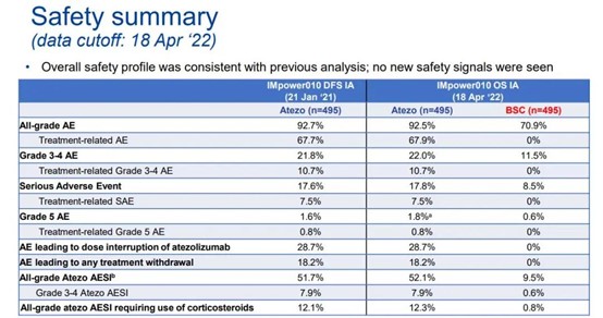 阿替利珠單抗組和BSC組患者中分別有22.0%和11.5%患者發(fā)生3-4級(jí)不良事件(AE),兩組的5級(jí)AE發(fā)生率為分別為 0.8%和0%。在接受阿替利珠單抗治療的患者中,52.1%發(fā)生特殊的AE;7.9%為3-4級(jí),0.4%為5級(jí)(肺炎/間質(zhì)性肺疾病和心肌炎)。DFS IA臨床截止日期后未發(fā)生新的5級(jí)AE。