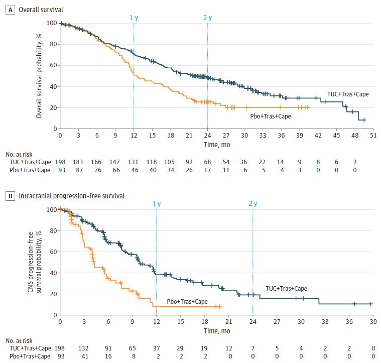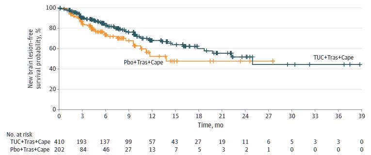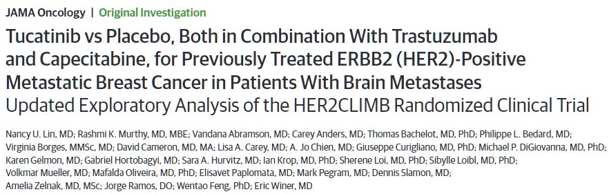 Lin NU, Murthy RK, Abramson V, et al. Tucatinib vs Placebo, Both in Combination With Trastuzumab and Capecitabine, for Previously Treated ERBB2 (HER2)-Positive Metastatic Breast Cancer in Patients With Brain Metastases: Updated Exploratory Analysis of the HER2CLIMB Randomized Clinical Trial. JAMA Oncol. Published online December 01, 2022. doi:10.1001/jamaoncol.2022.5610