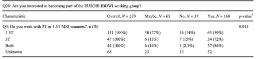 表 受訪者同時(shí)使用1.5T和3T掃描儀或僅使用3T掃描儀進(jìn)行臨床工作與加入掃描儀工作組的意愿之間的關(guān)系