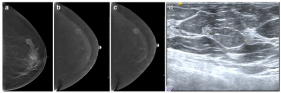 圖 一位53歲的患者,DBT上顯示腫塊(a),被列為BI-RADS 4A。CEM(b,c早期和晚期的重組圖像)顯示一個環(huán)形的腫塊,內部異質性強化,表現(xiàn)為持續(xù)的曲線,對應的KS為1。組織病理學顯示為纖維腺瘤