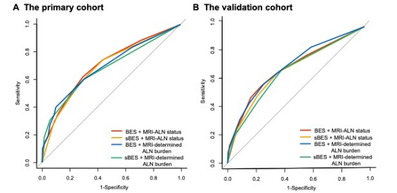 本研究共納入1092名患者。BES被確定為初級(jí)(n = 677)和驗(yàn)證(n = 415)隊(duì)列中pALN負(fù)荷的獨(dú)立預(yù)測(cè)因素。使用MRI-ALN狀態(tài)的分析顯示,BES顯著提高了pALN負(fù)荷的預(yù)測(cè)性能(AUC。0.65 vs 0.71,p < 0.001;IDI = 0.045,p < 0.001;連續(xù)NRI = 0.159,p = 0.050)。這些結(jié)果在驗(yàn)證隊(duì)列中得到了證實(shí)(AUC。0.64 vs 0.69, p = 0.009; IDI = 0.050, p < 0.001; 連續(xù)NRI = 0.213, p = 0.047)。此外,BES與侵襲性的臨床病理因素呈正相關(guān)(p < 0.05)。