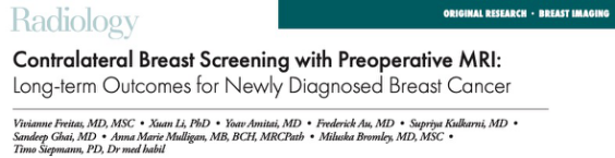 Vivianne Freitas,Xuan Li,Yoav Amitai,et al.Contralateral Breast Screening with Preoperative MRI: Long-Term Outcomes for Newly Diagnosed Breast Cancer.DOI:10.1148/radiol.212361