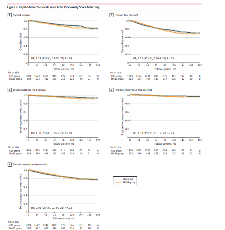 患者平均年齡44歲,其中603名患者接受了MABS(289名、302名和12名患者分別接受了內(nèi)鏡、內(nèi)鏡輔助或機(jī)器人輔助手術(shù)),1809名患者接受CBS。中位隨訪時(shí)間為84個(gè)月(MABS組93個(gè)月,CBS組80個(gè)月)。研究結(jié)果顯示主要的終點(diǎn)參數(shù)組間差異無(wú)顯著性意義:10年局部無(wú)復(fù)發(fā)生存率(93.3% vs 96.3%;風(fēng)險(xiǎn)比[HR],1.39),區(qū)域無(wú)復(fù)發(fā)生存率(95.5% vs 96.7%;HR,1.38),無(wú)遠(yuǎn)端轉(zhuǎn)移生存率(81.0% vs 82.0%;HR,0.95)。MABS組的5年、10年和15年無(wú)病生存率分別為85.9%、72.6%和69.1%,CBS組分別為85.0%、76.6%和70.7%,組間差異無(wú)統(tǒng)計(jì)學(xué)意義(HR:1.07)。MABS組的5年、10年和15年總生存率分別為92.0%、83.7%和83.0%,CBS組分別為93.6%、88.7%和81.0%,組間差異無(wú)統(tǒng)計(jì)學(xué)意義(HR:1.29)。術(shù)后亞組分析顯示,組間無(wú)病生存期無(wú)顯著差異。