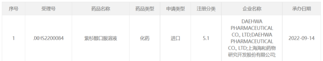 9月14日,CDE官網(wǎng)顯示,海和藥物和大化制藥合作開(kāi)發(fā)的紫杉醇口服液的上市申請(qǐng)已獲受理,適應(yīng)癥為二線治療晚期胃癌。