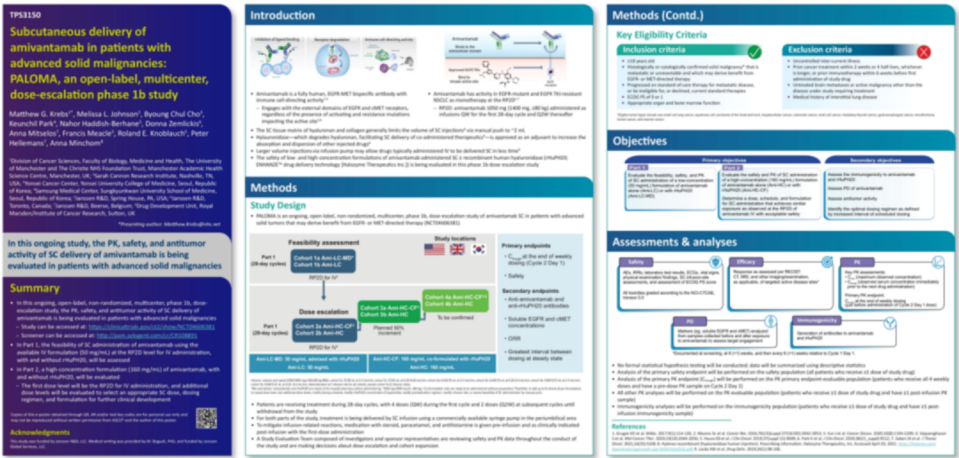 于2020年10月披露了一項(xiàng)amivantamab皮下注射劑型治療晚期實(shí)體惡性腫瘤的I期臨床研究(NCT04606381,PALOMA研究)。今年AACR大會(huì)上公布的I期的PALOMA研究結(jié)果顯示,amivantamab皮下注射劑型的使用,具有很好的療效和安全性。