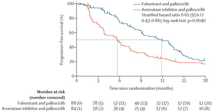 2017年3月22日至2019年1月31日,共納入了1017位患者,其中279位(27%)出現(xiàn)bESR1突變上升,172位(17%)被隨機(jī)分至兩組:88位改為氟維司群+帕博西尼治療,84位繼續(xù)用原方案治療。截止2021年7月31日,從納入起中位隨訪了35.3個(gè)月,從隨機(jī)分組起中位隨訪了26.0個(gè)月。氟維司群+帕博西尼組和芳香化酶抑制劑+帕博西尼組從隨機(jī)分組起的中位無(wú)進(jìn)展生存期分別是11.9個(gè)月和5.7個(gè)月(分層HR 0.61,p=0.0040)。