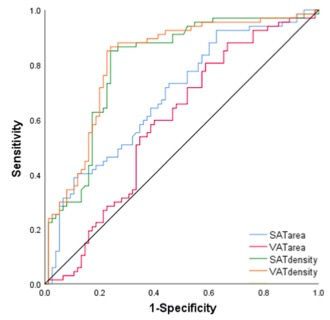 圖 預測OS的SAT面積、SAT密度、VAT面積和VAT密度的ROC曲線圖