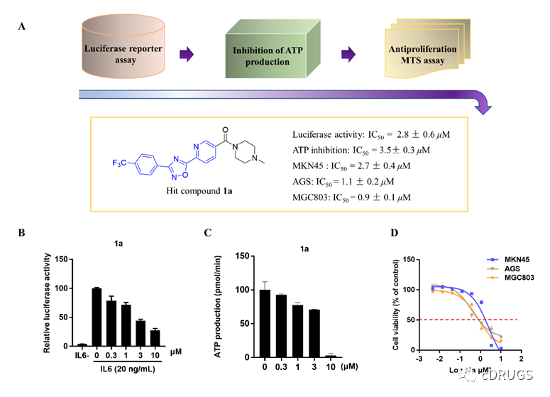 圖2.STAT3雙磷酸化抑制劑的篩選策略及苗頭化合物1a的發(fā)現(xiàn)