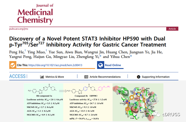 2022年9月14日,國際藥物化學權(quán)威期刊《Journal of Medicinal Chemistry》在線發(fā)表了華東師范大學陳益華/易正芳研究員團隊合作的最新研究成果“Discovery of a Novel Potent STAT3 Inhibitor HP590 with Dual p-Tyr705/Ser727 Inhibitory Activity for Gastric Cancer Treatment”。這是繼4月27日陳益華團隊在同期刊發(fā)表“Discovery of 2-Amino-3-cyanothiophene Derivatives as Potent STAT3 Inhibitors for the Treatment of Osteosarcoma Growth and Metastasis”后在STAT3抑制劑研究方面取得的又一次重要突破。