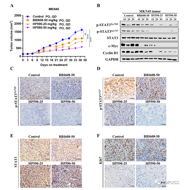圖7.HP590在體內(nèi)通過抑制STAT3雙位點磷酸化顯著抑制胃癌細胞的增殖