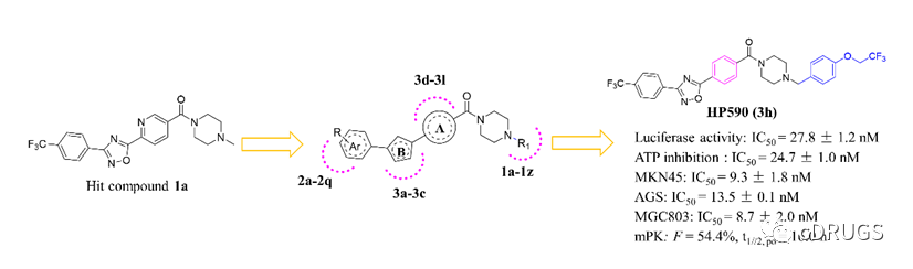 本研究中,作者們以STAT3雙位點磷酸化在胃癌細胞發(fā)生發(fā)展的重要角色為背景,基于STAT3雙位點磷酸化在腫瘤細胞中介導不同生物學功能建立了全新的STAT3雙磷酸化抑制劑的高通量篩選實驗,即表征STAT3 p-Tyr705抑制活性的STAT3依賴性熒光素酶實驗(Luciferase reporter assay)和用于表征p-Ser727抑制活性的ATP抑制實驗 (ATP inhibition assay)。隨后,通過篩選大量化合物,作者獲得一個能在微摩爾水平顯著抑制STAT3熒光素酶活性、胃癌細胞中ATP生成以及多株胃癌細胞增殖的理想苗頭化合物1a(圖2)。為了進一步提高苗頭化合物1a的生物活性,作者們進行了理性的藥物化學設(shè)計與構(gòu)效該系研究,最終導致了具有低納摩爾抗腫瘤活性的先導化合物HP590的發(fā)現(xiàn)(圖3)。同時,作者們還在本文中總結(jié)了這類三芳香雜環(huán)STAT3雙磷酸化抑制劑的構(gòu)效關(guān)系,其具體內(nèi)容如圖4所示。