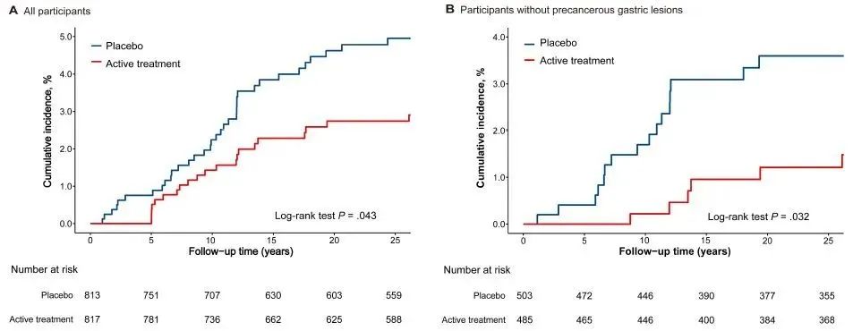 在26.5年隨訪期間,治療組和安慰劑組分別有21位(2.57%)和35位(4.31%)受試者被確診為胃癌。與接受安慰劑處理的對(duì)照相比,接受幽門(mén)螺旋桿菌治療的受試者胃癌的發(fā)生率較低(風(fēng)險(xiǎn)比[HR] 0.57)。在基線無(wú)胃癌癌前病變和無(wú)消化不良癥狀的受試者中,根除幽門(mén)螺旋桿菌的胃癌風(fēng)險(xiǎn)降低更為明顯(HR分別是0.37和0.44)。此外,與安慰劑組527位持續(xù)性幽門(mén)螺旋桿菌感染的受試者中觀察到的32例胃癌相比,成功根除幽門(mén)螺旋桿菌的625位受試者中只發(fā)現(xiàn)了16例胃癌(HR 0.46)。但是,兩組的任何死亡終點(diǎn)之間都沒(méi)有顯著差異。