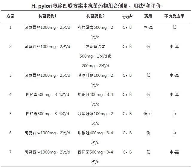 注:a標(biāo)準(zhǔn)劑量質(zhì)子泵抑制劑+標(biāo)準(zhǔn)劑量鉍劑(2次/d,餐前小時(shí)口服)+2種抗菌藥物(餐后口服)。標(biāo)準(zhǔn)劑量質(zhì)子泵抑制劑為艾司奧美拉唑20mg,雷貝拉唑10mg(或20mg)、奧美拉唑20mg,蘭索拉唑30mg,泮托拉唑40mg,艾普拉唑5mg,以上選一;標(biāo)準(zhǔn)劑量鉍劑為枸櫞酸鉍鉀220mg(果膠鉍標(biāo)準(zhǔn)劑量待確定);b療效按Graham分級(jí):C級(jí)為85%-90%,B級(jí)為90%-94%