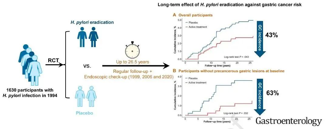 這是一項(xiàng)在我國(guó)南方胃癌高風(fēng)險(xiǎn)去開(kāi)展的前瞻性、隨機(jī)、安慰劑為對(duì)照的臨床試驗(yàn)。自1994年7月期,共招募了1630位無(wú)癥狀的幽門(mén)螺旋桿菌感染者,隨機(jī)(1:1)分組接受幽門(mén)螺旋桿菌根除治療的標(biāo)準(zhǔn)三聯(lián)療法(n=817)或安慰劑(n=813),然后隨訪至2020年12月。主要終點(diǎn)是胃癌的發(fā)生率。次要終點(diǎn)是總死亡率和原因特異性的死亡率。