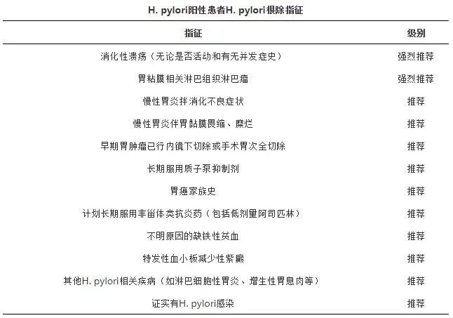 H.pylori所致胃炎作為一種感染性疾病,似乎所有的H.pylori陽(yáng)性者均有必要治療,但應(yīng)該看到,目前我國(guó)的H.pylori感染率仍達(dá)約50%,主動(dòng)篩查所有的H. pylori陽(yáng)性者并進(jìn)行治療目前難以達(dá)成,現(xiàn)階段仍然需要遵從根除H. pylori指征(下表),以便主動(dòng)對(duì)獲益較大的個(gè)體進(jìn)行H. pylori檢測(cè)和治療。