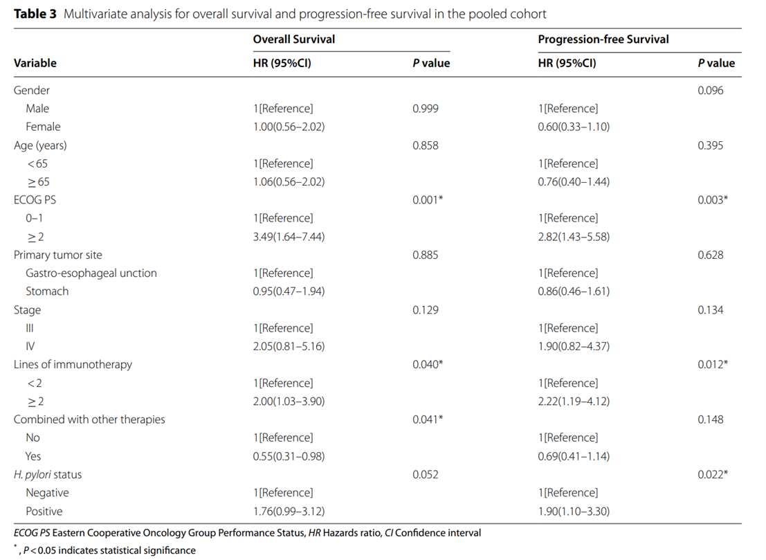 Cox回歸顯示幽門螺桿菌感染與PFS獨立相關(guān)(HR = 1.90,95% CI:1.10-3.30;P = 0.022)。盡管幽門螺桿菌感染與OS之間存在相關(guān)性(HR = 1.76,95% CI:0.99–3.12),但無統(tǒng)計學(xué)意義(P = 0.052)。