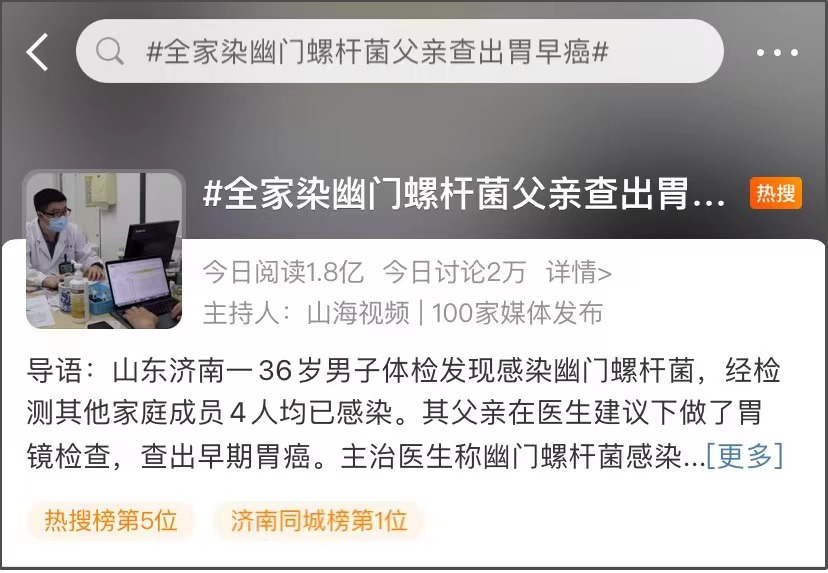 山東濟南一36歲男子體檢發(fā)現(xiàn)感染幽門螺桿菌,經(jīng)檢測其他家庭成員4人均已感染。其父親在醫(yī)生建議下做了胃鏡檢查,查出早期胃癌,經(jīng)過手術(shù)目前恢復(fù)良好。主治醫(yī)生介紹幽門螺桿菌感染會導(dǎo)致慢性活動性胃炎、消化性潰瘍等疾病,如終生不殺菌約5%的患者會發(fā)生胃癌。醫(yī)生提示,幽門螺桿菌經(jīng)口傳播,個人如發(fā)現(xiàn)感染,建議其他家庭成員一同檢測做主動篩查。醫(yī)院就診或在疫情下選擇居家自測。
