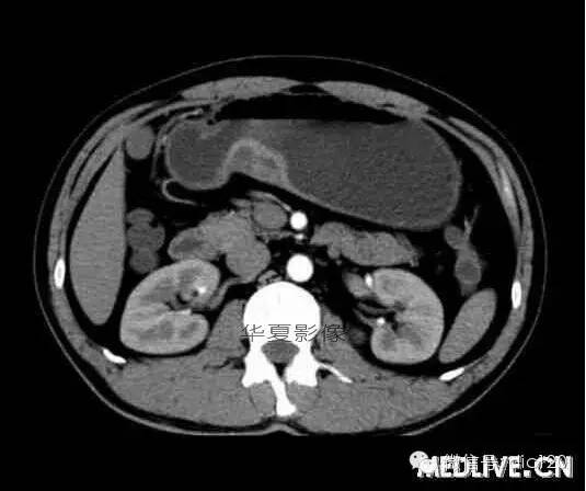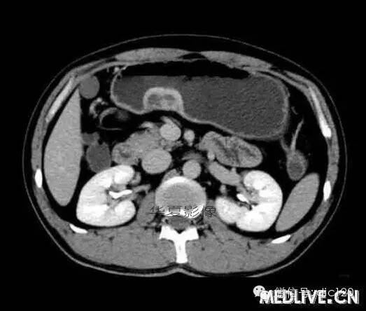 3、胃癌的胃黏膜破壞,胃壁僵硬,病灶密度不均勻,增強(qiáng)呈輕中度強(qiáng)化。胃異位胰腺是一種少見的黏膜下病變,臨床誤診率較高。