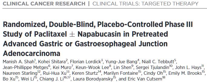 Manish A. Shah, Kohei Shitara, Florian Lordick, et al; Randomized, Double-Blind, Placebo-Controlled Phase III Study of Paclitaxel ± Napabucasin in Pretreated Advanced Gastric or Gastroesophageal Junction Adenocarcinoma. Clin Cancer Res 2022; https://doi.org/10.1158/1078-0432.CCR-21-4021