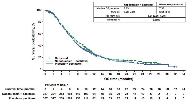 該研究是一項(xiàng)雙盲的3期臨床試驗(yàn),受試患者被1:1隨機(jī)分至Napabucasin(480 mg*2/天)+紫杉醇(80 mg/m2,靜脈,3-4周一次)組或安慰劑+紫杉醇組。主要終點(diǎn)是總生存期(OS)。次要終點(diǎn)包括無(wú)進(jìn)展生存期(PFS)、客觀緩解率(ORR)、疾病控制率(DCR)和安全性。