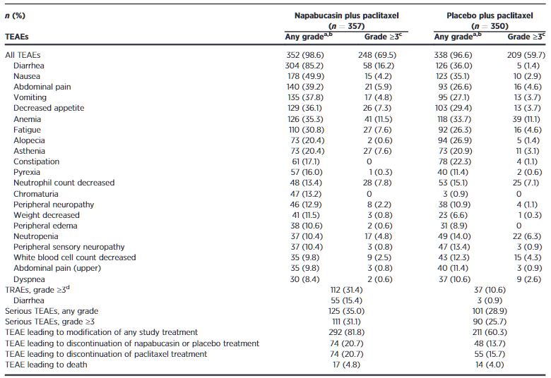 Napabucasin組和安慰劑組3級(jí)及以上不良反應(yīng)的發(fā)生率分別是69.5%和59.7%,3級(jí)及以上腹瀉的發(fā)生率分別是16.2%和1.4%。