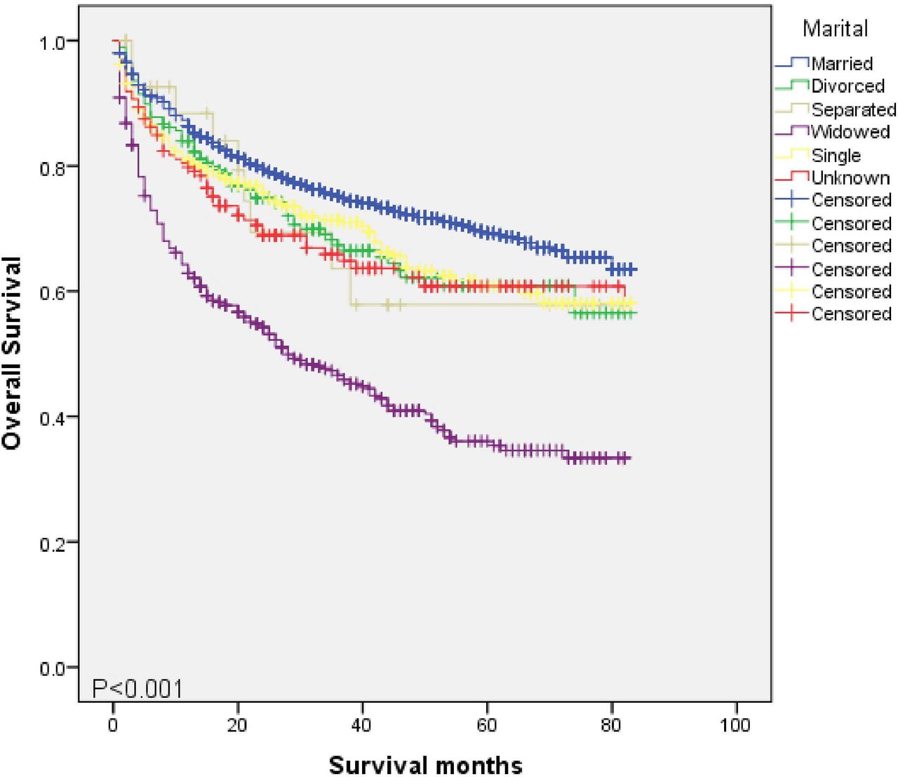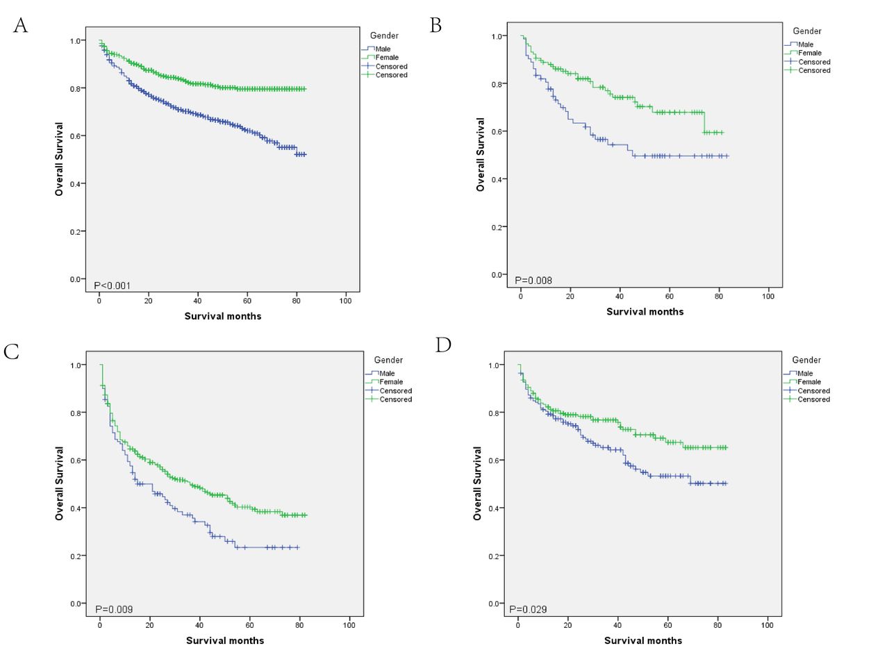 同時(shí),研究人員還對(duì)性別中每個(gè)已知的婚姻狀況組進(jìn)行了Kaplan-Meier分析。如圖4所示,每個(gè)婚姻狀況組的男性和女性患者之間存在顯著差異(已婚,p<0.001,圖4A;離婚,p=0.020,圖4B;喪偶,p=0.025,圖4C;單身,p=0.026,圖4D)。女性患者的生存率高于男性患者。