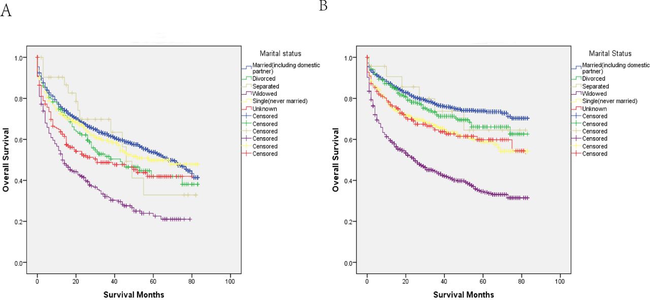 即使對(duì)于接受系統(tǒng)治療的早期GC患者,也很難準(zhǔn)確預(yù)測(cè)GC預(yù)后。因此,結(jié)合治療后指標(biāo)建立可靠的預(yù)測(cè)模型是有意義的。近年來(lái),與前列腺癌、宮頸癌和直腸癌相關(guān)的婚姻狀況已成為一種創(chuàng)新的危險(xiǎn)因素。但目前仍很少有研究關(guān)注社會(huì)因素對(duì)早期GC預(yù)后的影響。因此,本研究旨在結(jié)合臨床指標(biāo)和社會(huì)因素,建立新的評(píng)分系統(tǒng),為預(yù)測(cè)早期GC患者的總生存期(OS)提供依據(jù)。