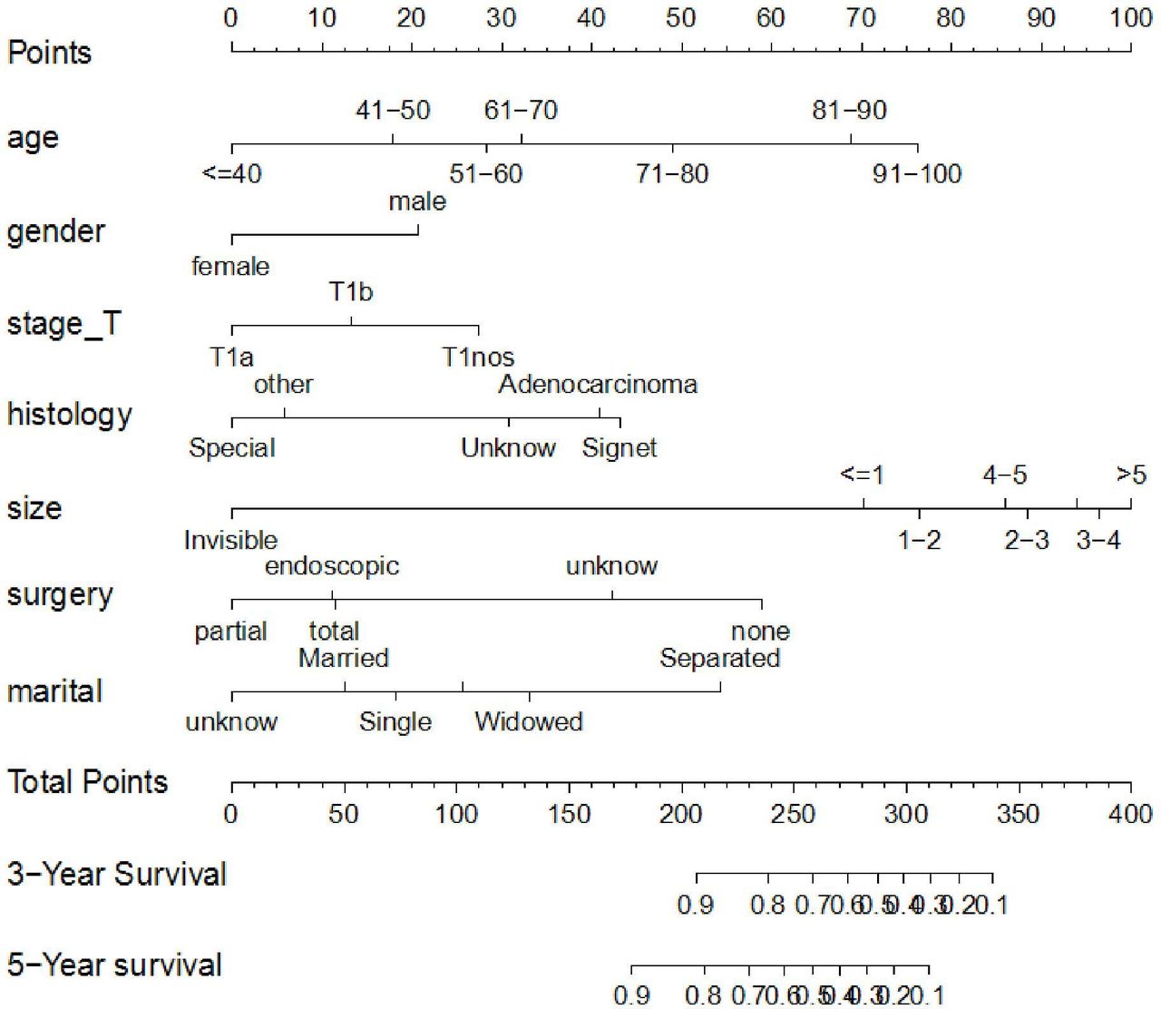 基于Cox回歸模型,研究人員構(gòu)建了一個(gè)列線圖來(lái)預(yù)測(cè)早期GC患者的3年和5年OS(圖5)。這個(gè)列線圖創(chuàng)建了一個(gè)評(píng)分系統(tǒng),其中每個(gè)包含的變量都可以根據(jù)其對(duì)OS的貢獻(xiàn)獲得相應(yīng)的0-100分。將這些分?jǐn)?shù)相加以計(jì)算總分后,根據(jù)圖底部的量表預(yù)測(cè)相應(yīng)OS。該列線圖顯示,腫瘤大小是最重要的預(yù)后因素,其次是診斷和手術(shù)時(shí)的年齡。T分期、婚姻狀況、性別和組織學(xué)對(duì)早期GC患者的預(yù)后也有中等影響。