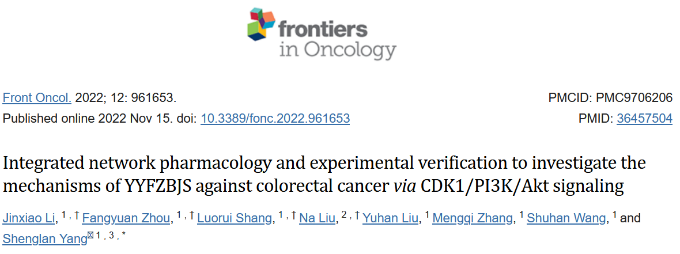 Li J, Zhou F, Shang L, et al. Integrated network pharmacology and experimental verification to investigate the mechanisms of YYFZBJS against colorectal cancer via CDK1/PI3K/Akt signaling. Front Oncol. 2022;12:961653. Published 2022 Nov 15. doi:10.3389/fonc.2022.961653