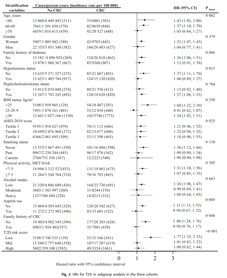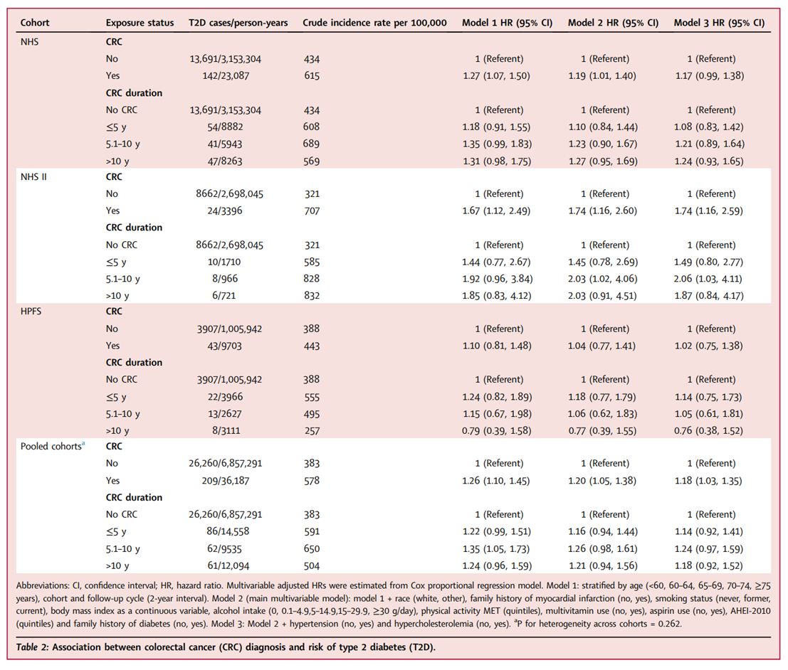 研究人員評估了來自護士健康研究的111485名女性,來自護士健康研究II的112958名女性和來自衛(wèi)生專業(yè)人員隨訪研究的46581名男性的CRC和T2D的診斷,使用多變量Cox回歸和時變協(xié)變量來計算T2D與CRC診斷相關(guān)的風(fēng)險比(HR),并進一步對隊列研究進行了系統(tǒng)評價和meta分析。