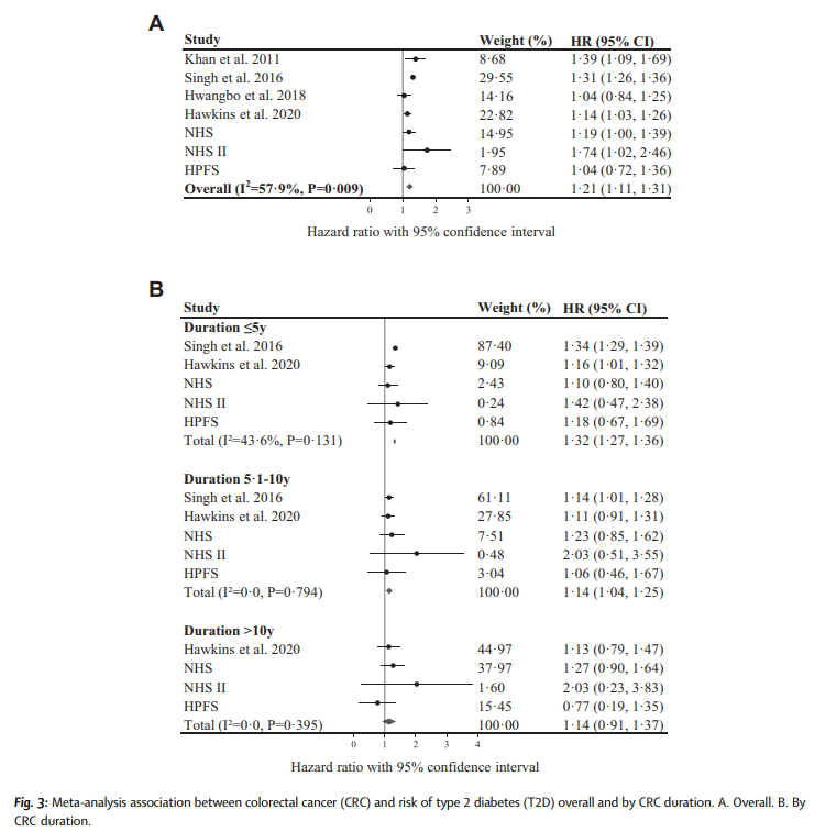 在對七項隊列研究(1061744名受試者)的薈萃分析中,CRC與較高的T2D風(fēng)險相關(guān)(薈萃分析HR 1.21,95%CI 1.11–1.31,I2= 57.9%)。按結(jié)直腸癌持續(xù)時間劃分,在CRC診斷的前10年觀察到統(tǒng)計學(xué)上的相關(guān)性,但在結(jié)直腸癌診斷10年后未觀察到統(tǒng)計學(xué)上的相關(guān)性(≤5年,meta分析HR 1.32,95%CI 1.27–1.36;5.1–10年,1.14 [1.04–1.25];>10年,1.14 [0.91–1.37])。