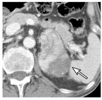 圖 一名67歲的男性,患有乙狀結(jié)腸癌。增強(qiáng)CT圖像顯示左側(cè)腎上腺有一個74毫米的結(jié)節(jié)(箭頭)。腎上腺切除術(shù)后,該結(jié)節(jié)被證實為腎上腺皮質(zhì)癌。結(jié)腸癌經(jīng)息肉切除術(shù)后確認(rèn)為PT1期