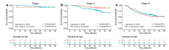 圖 根據(jù)列線圖預(yù)測的MSI狀態(tài),I期(a)、II期(b)和III期(c)結(jié)直腸癌患者的Kaplan-Meier曲線