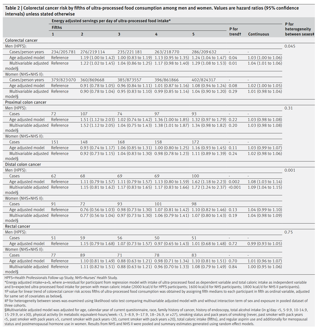 結(jié)果顯示,隨訪24~28年,記錄結(jié)直腸癌3216例(男性,n=1294;女性,n=1922)。與超加工食品消費量中最低五分之一的男性相比,消費量最高五分之一的男性患結(jié)直腸癌的風(fēng)險高出29%(最高與最低五分之一的風(fēng)險比為1.29,95%CI,1.08至1.53;趨勢P=0.01),陽性關(guān)聯(lián)僅限于遠(yuǎn)端結(jié)腸癌(風(fēng)險增加72%;風(fēng)險比1.72,1.24-2.37;P 表示趨勢<0.001)。在進(jìn)一步調(diào)整體重指數(shù)或飲食營養(yǎng)質(zhì)量指標(biāo)(即西方飲食模式或飲食質(zhì)量評分)后,這些關(guān)聯(lián)仍然顯著。在女性中,沒有觀察到過度加工食品的整體消費與結(jié)直腸癌風(fēng)險之間的聯(lián)系。