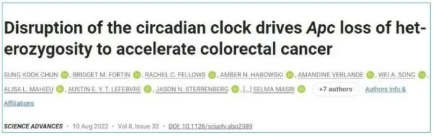 這項研究的標(biāo)題是“Disruption of the circadian clock drives Apc loss of heterozygosity to accelerate colorectal cancer”,于8月10日發(fā)表在《Science Advances》雜志上。