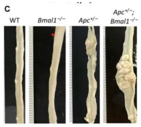 在研究過程中,科學(xué)家們開發(fā)了一種新的組織特異性基因工程小鼠模型(GEMM)來定義連接晝夜節(jié)律破壞和CRC發(fā)病機制的分子途徑。研究結(jié)果表明,與單獨使用Apc的破壞相比,腸道Apc和Bmal1的遺傳缺失導(dǎo)致息肉形成在統(tǒng)計學(xué)上顯著增加。他們還證明了環(huán)境對生物鐘的破壞會加速APC突變,從而增加了GEMM小鼠模型中的腫瘤負擔(dān)。