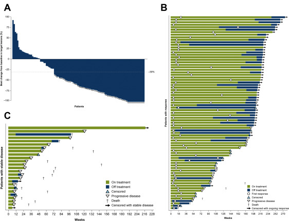 根據(jù)研究者的評(píng)估,65% 的患者(n = 77;95% CI 55-73)實(shí)現(xiàn)了客觀反應(yīng)。81% 的患者(95% CI 72-87)疾病控制超過12 周!