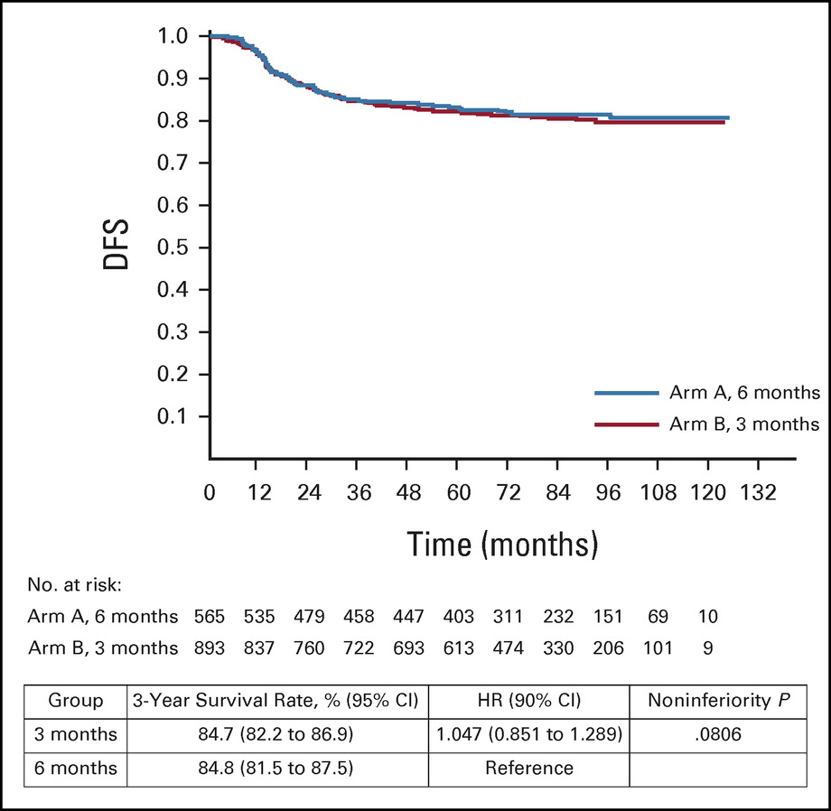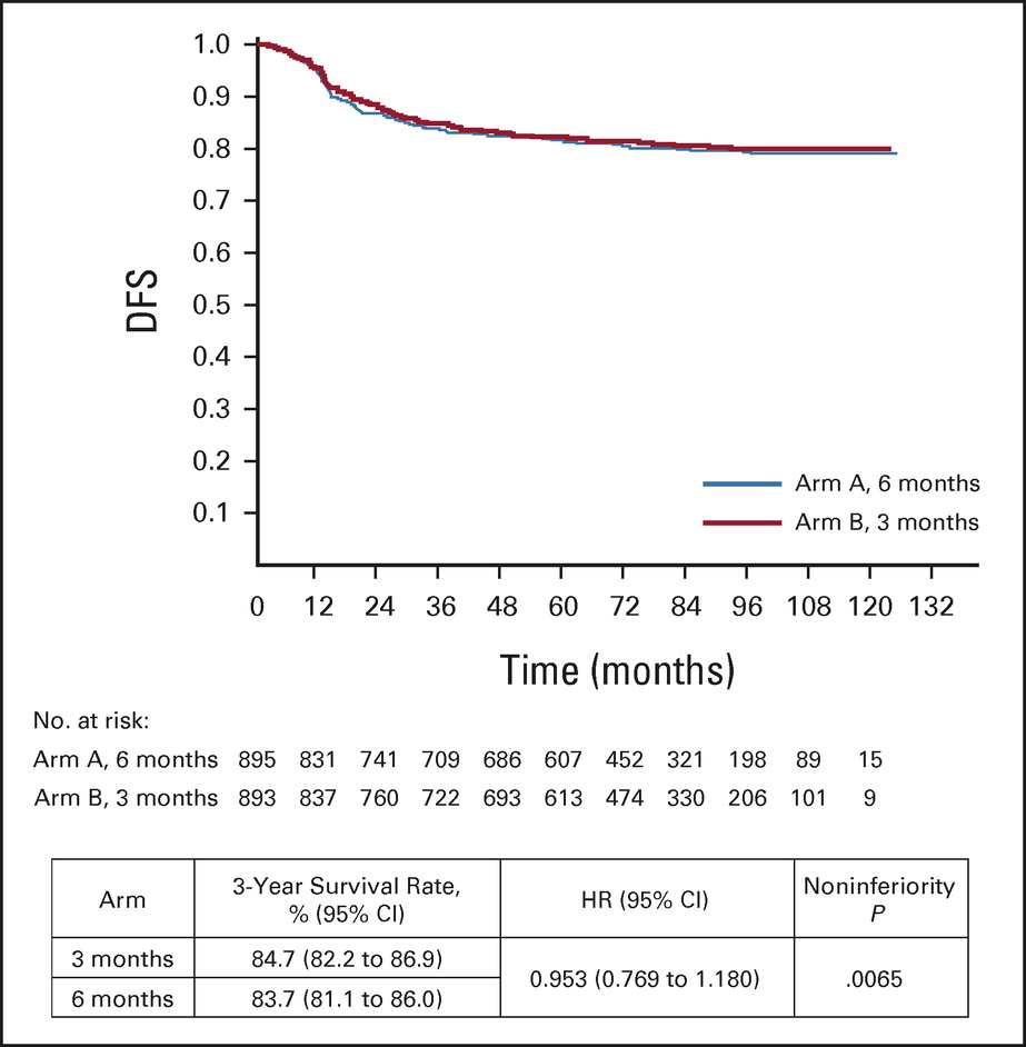 共1788例患者被隨機分配到6個月組(n = 895)和3個月組(n = 893),其中6個月組和3個月組分別有83.6%和85.7%的患者完成了治療。6個月組任何級別的神經(jīng)病變率均高于3個月組(69.5% v 58.3%; P < .0001)。6個月和3個月組的3年DFS率分別為83.7%和84.7%,HR為0.953 (95% CI, 0.769 - 1.180;非劣效性檢驗,P = 0.0065)。