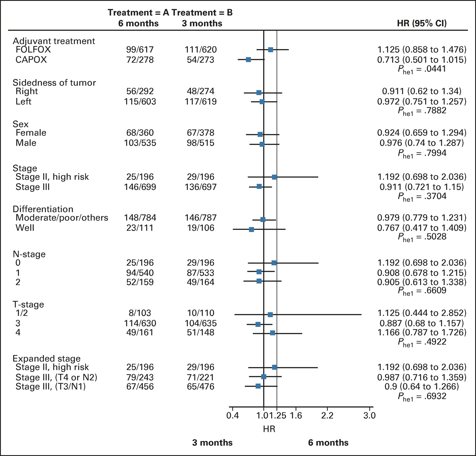 這項開放標(biāo)簽、隨機、III 期、非劣效性試驗將高危 II 期和 III 期 CRC 患者隨機分配到 3 個月和 6 個月的奧沙利鉑組,以及 6 個月的氟嘧啶組(分別為 3 個月和 6 個月組)。主要終點是無病生存期(DFS),非劣勢邊際是1.25的風(fēng)險比(HR)。