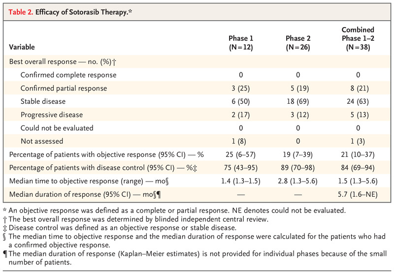 1 期的主要目標(biāo)是評估安全性并確定 2 期的推薦劑量。在 2 期,患者每天口服一次 960 毫克的 sotorasib。 第 2 階段的主要終點是中央確認(rèn)的客觀反應(yīng)(定義為完全或部分反應(yīng))。 在兩個階段的合并人群中評估療效終點,包括客觀反應(yīng)、反應(yīng)持續(xù)時間、達(dá)到客觀反應(yīng)的時間、疾病控制(定義為客觀反應(yīng)或疾病穩(wěn)定)、無進(jìn)展生存期和總生存期。 還評估了安全性。