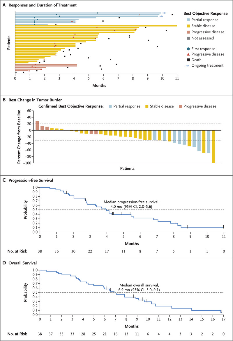 在兩個階段的 38 名患者中,8 名患者(21%;95% 置信區(qū)間 [CI],10 至 37)經(jīng)盲法獨立中央審查評估確認(rèn)部分緩解(表 2)。 沒有患者有完全反應(yīng)。 表 S2 中提供了根據(jù)研究者評估做出的答復(fù)。 在這 8 名患者中,中位緩解時間為 1.5 個月(范圍,1.3 至 5.6),緩解持續(xù)時間為 5.7 個月(95% CI,1.6 至無法評估)(表 2)。 在這些患者中,有 5 名 (62%) 在大約第 6 周的第一次腫瘤評估時觀察到反應(yīng)。截至數(shù)據(jù)截止日期,8 名患者中有 2 名 (25%) 繼續(xù)接受治療, 持續(xù)治療時間約為 10 個月(圖 1A)。