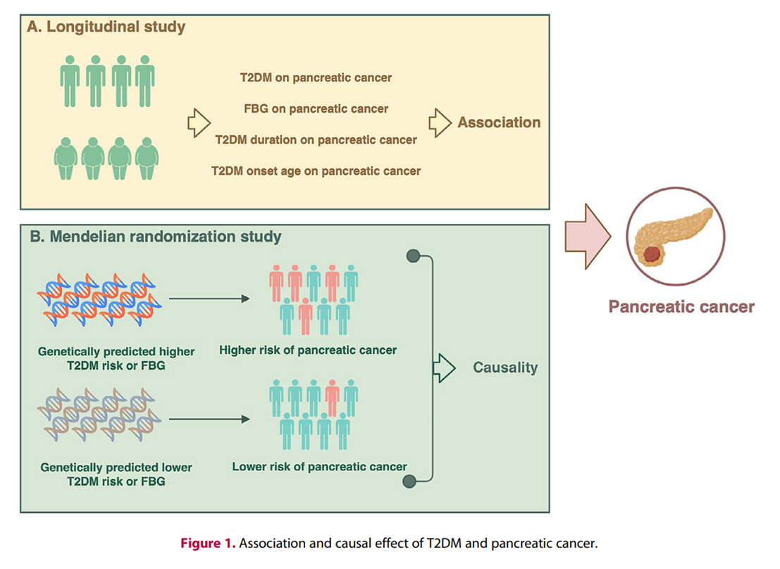 本分析旨在研究糖尿病發(fā)病年齡與胰腺癌糖尿病持續(xù)時間之間的關(guān)系,研究了不同水平的FBG與胰腺癌風(fēng)險的關(guān)系,并使用雙樣本孟德爾隨機(jī)化(MR)研究了支持2型糖尿病與胰腺癌之間在單獨的東亞人群中的因果關(guān)系的其他證據(jù)(圖1)。