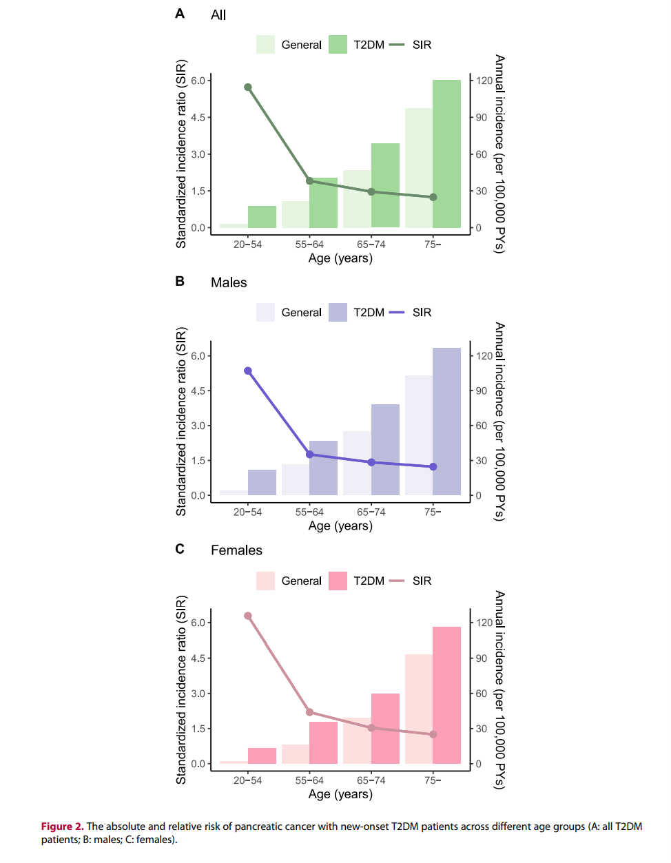 然而,相對胰腺癌風(fēng)險以SIR表示,與T2DM發(fā)病時的年齡成反比,在20~54歲組中觀察到更高的SIR為5.73(95%CI,4.49–7.22)(圖2)。