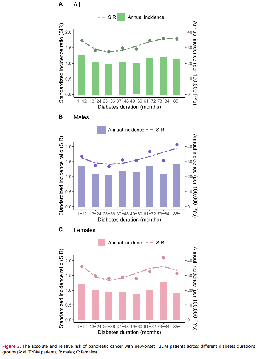 研究人員研究了胰腺癌與T2DM持續(xù)時間的相關(guān)性,每12個月一次。如圖3所示,在共8年隨訪中,新發(fā)T2DM與胰腺癌風(fēng)險升高顯著相關(guān),≤1年內(nèi)(64.31; 1.73),6年內(nèi)(58.55;1.73),7年(59.47; 1.79)和7年以上(57.42; 1.78)診斷T2DM的總發(fā)病率和SIR較高。