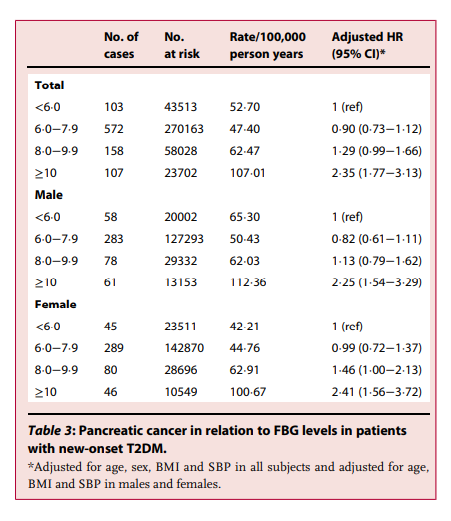 研究人員研究了各種FBG水平與新發(fā)T2DM患者患胰腺癌風(fēng)險的關(guān)系。分類分析顯示,空腹血糖≥10.0 mmol/L組的胰腺癌風(fēng)險明顯高于FBG較低的組。與<6.0 mmol/L的FBG相比,F(xiàn)BG≥10.0 mmol/L患者的胰腺癌風(fēng)險比為2.35(95% CI;1.77–3.13)。(表3)