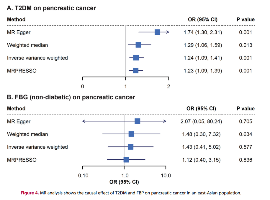 MR分析表明,T2DM與東亞人群中胰腺癌風(fēng)險增加24%(OR:1.24,95%CI:1.09-1.41,p = 0.001)有關(guān)。然而,正常范圍內(nèi)的FBG水平升高與胰腺癌風(fēng)險沒有因果關(guān)系(p = 0.577)(圖4)。