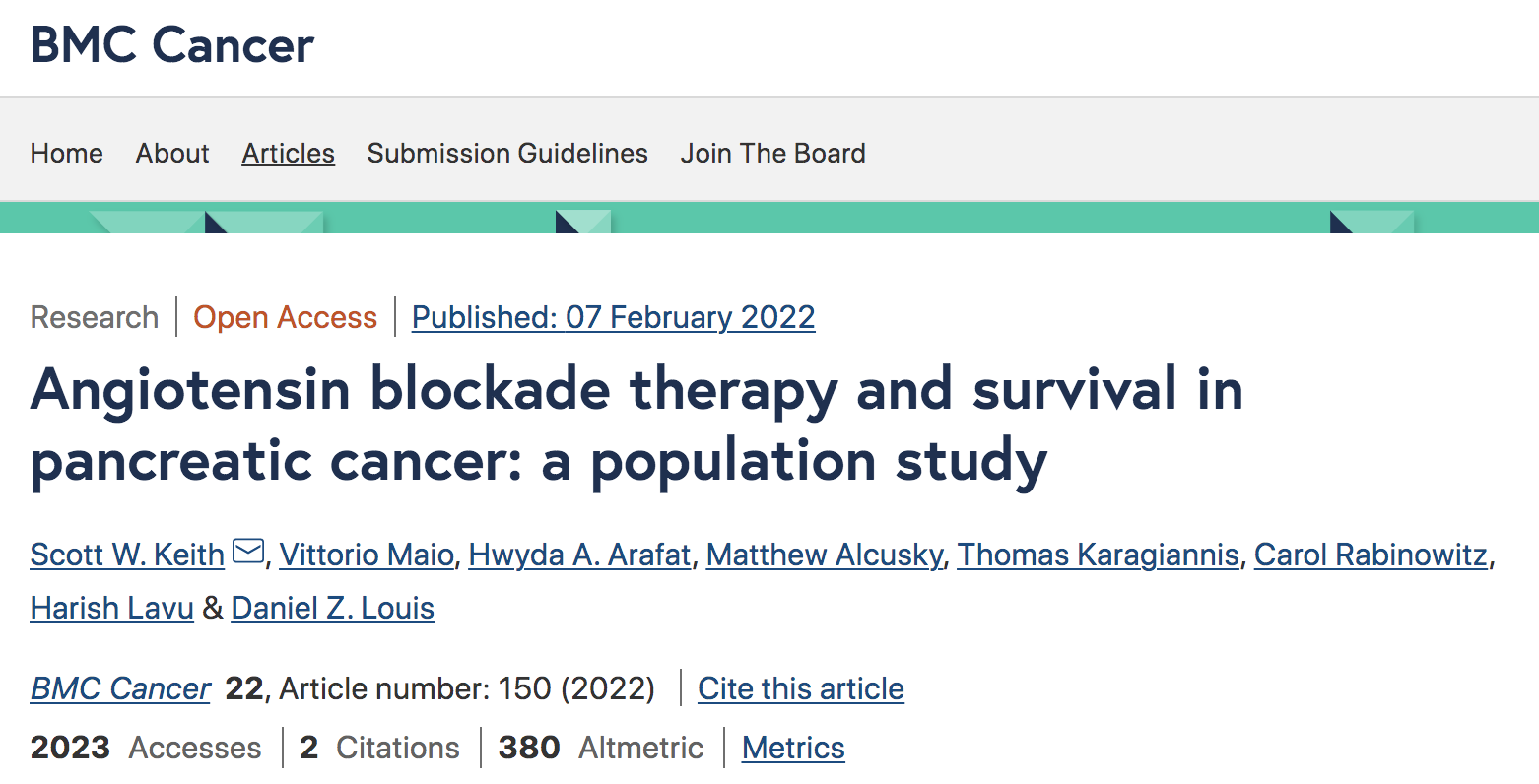 Scott W. Keith et al, Angiotensin blockade therapy and survival in pancreatic cancer: a population study, BMC Cancer (2022). DOI: 10.1186/s12885-022-09200-4